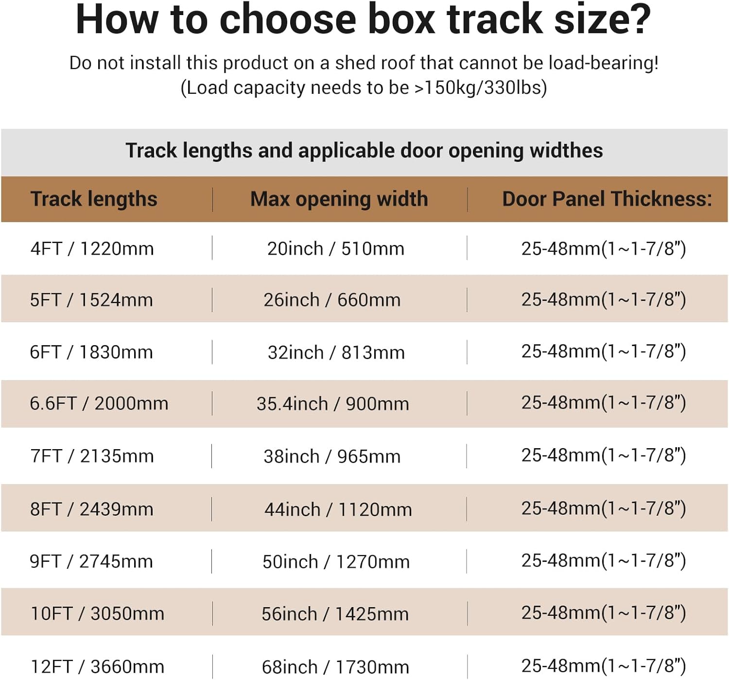 - 【Suitable For】This 60’’sliding barn door box track fit Max door opening 26" ,fit Max door panel width 30". Fit door thickness: 1"~ 1-7/8"(25mm~48mm).Door weight capacity 330lbs/150kg.